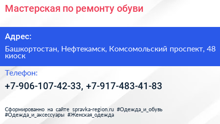 Мастерская по ремонту обуви по адресу Башкортостан, Нефтекамск, Комсомольский проспект, 48 киоск в дальнейшем Организация, размещена в следующих категориях: