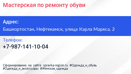 Мастерская по ремонту обуви по адресу Башкортостан, Нефтекамск, улица Карла Маркса, 2 в дальнейшем Организация, размещена в следующих категориях: