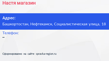 Настя, магазин по адресу Башкортостан, Нефтекамск, Социалистическая улица, 18 в дальнейшем Организация, размещена в следующих категориях: