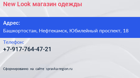 New Look, магазин одежды по адресу Башкортостан, Нефтекамск, Юбилейный проспект, 18 в дальнейшем Организация, размещена в следующих категориях: