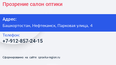 Прозрение, салон оптики по адресу Башкортостан, Нефтекамск, Парковая улица, 4 в дальнейшем Организация, размещена в следующих категориях: