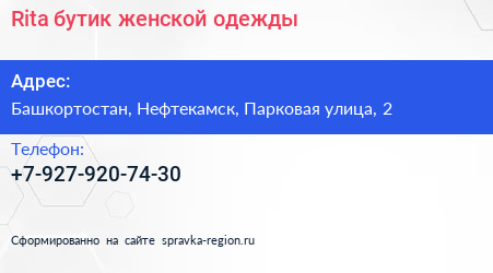 Rita, бутик женской одежды по адресу Башкортостан, Нефтекамск, Парковая улица, 2 в дальнейшем Организация, размещена в следующих категориях:
