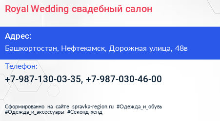 Royal Wedding, свадебный салон по адресу Башкортостан, Нефтекамск, Дорожная улица, 48в в дальнейшем Организация, размещена в следующих категориях: