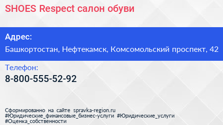 SHOES Respect, салон обуви по адресу Башкортостан, Нефтекамск, Комсомольский проспект, 42 в дальнейшем Организация, размещена в следующих категориях: