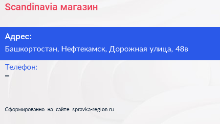 Scandinavia, магазин по адресу Башкортостан, Нефтекамск, Дорожная улица, 48в в дальнейшем Организация, размещена в следующих категориях: