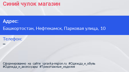 Синий чулок, магазин по адресу Башкортостан, Нефтекамск, Парковая улица, 10 в дальнейшем Организация, размещена в следующих категориях: