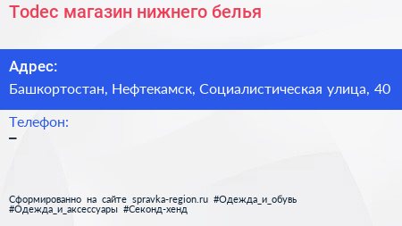 Todec, магазин нижнего белья по адресу Башкортостан, Нефтекамск, Социалистическая улица, 40 в дальнейшем Организация, размещена в следующих категориях: