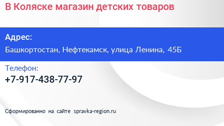 В Коляске, магазин детских товаров по адресу Башкортостан, Нефтекамск, улица Ленина, 45Б в дальнейшем Организация, размещена в следующих категориях: