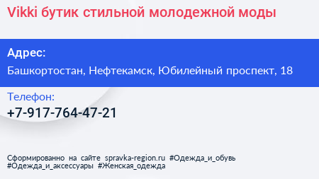 Vikki, бутик стильной молодежной моды по адресу Башкортостан, Нефтекамск, Юбилейный проспект, 18 в дальнейшем Организация, размещена в следующих категориях:
