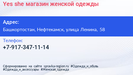 Yes she, магазин женской одежды по адресу Башкортостан, Нефтекамск, улица Ленина, 58 в дальнейшем Организация, размещена в следующих категориях: