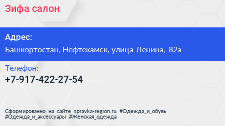 Зифа, салон по адресу Башкортостан, Нефтекамск, улица Ленина, 82а в дальнейшем Организация, размещена в следующих категориях: