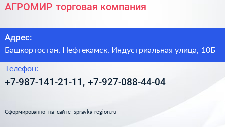 АГРОМИР, торговая компания по адресу Башкортостан, Нефтекамск, Индустриальная улица, 10Б в дальнейшем Организация, размещена в следующих категориях: