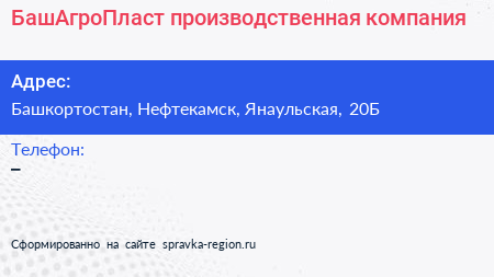 БашАгроПласт, производственная компания по адресу Башкортостан, Нефтекамск, Янаульская, 20Б в дальнейшем Организация, размещена в следующих категориях: