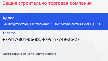 Башня, строительно-торговая компания по адресу Башкортостан, Нефтекамск, Высоковольтная улица, 1Б в дальнейшем Организация, размещена в следующих категориях: