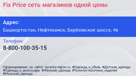 Fix Price, сеть магазинов одной цены по адресу Башкортостан, Нефтекамск, Берёзовское шоссе, 4в в дальнейшем Организация, размещена в следующих категориях: