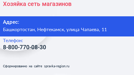 Хозяйка, сеть магазинов по адресу Башкортостан, Нефтекамск, улица Чапаева, 11 в дальнейшем Организация, размещена в следующих категориях: