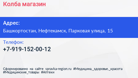 Колба, магазин по адресу Башкортостан, Нефтекамск, Парковая улица, 15 в дальнейшем Организация, размещена в следующих категориях: