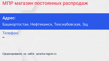 МПР, магазин постоянных распродаж по адресу Башкортостан, Нефтекамск, Техснабовская, 3щ в дальнейшем Организация, размещена в следующих категориях: