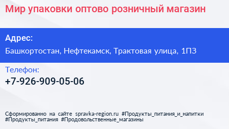Мир упаковки, оптово-розничный магазин по адресу Башкортостан, Нефтекамск, Трактовая улица, 1ПЗ в дальнейшем Организация, размещена в следующих категориях: