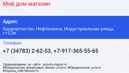 Мой дом, магазин по адресу Башкортостан, Нефтекамск, Индустриальная улица, ст12ж в дальнейшем Организация, размещена в следующих категориях: