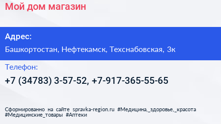 Мой дом, магазин по адресу Башкортостан, Нефтекамск, Техснабовская, 3к в дальнейшем Организация, размещена в следующих категориях: