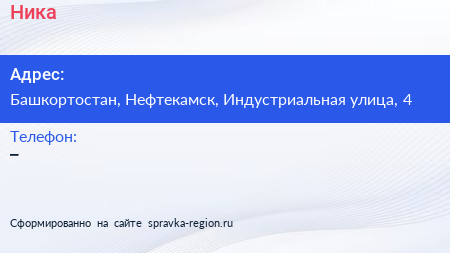 Ника по адресу Башкортостан, Нефтекамск, Индустриальная улица, 4 в дальнейшем Организация, размещена в следующих категориях: