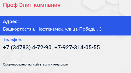 Проф & Элит, компания по адресу Башкортостан, Нефтекамск, улица Победы, 3 в дальнейшем Организация, размещена в следующих категориях: