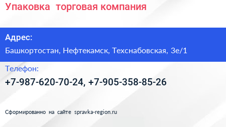 Упаковка+, торговая компания по адресу Башкортостан, Нефтекамск, Техснабовская, 3е/1 в дальнейшем Организация, размещена в следующих категориях: