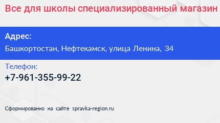 Все для школы, специализированный магазин по адресу Башкортостан, Нефтекамск, улица Ленина, 34 в дальнейшем Организация, размещена в следующих категориях: