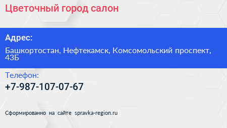 Цветочный город, салон по адресу Башкортостан, Нефтекамск, Комсомольский проспект, 43Б в дальнейшем Организация, размещена в следующих категориях: