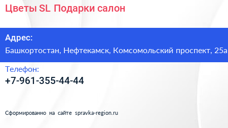 Цветы SL Подарки, салон по адресу Башкортостан, Нефтекамск, Комсомольский проспект, 25а в дальнейшем Организация, размещена в следующих категориях: