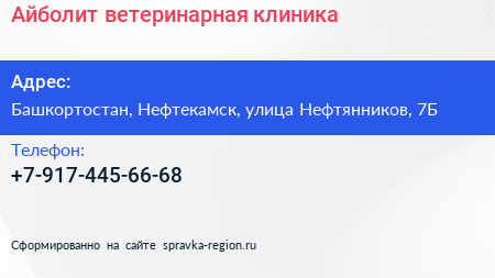 Айболит, ветеринарная клиника по адресу Башкортостан, Нефтекамск, улица Нефтянников, 7Б в дальнейшем Организация, размещена в следующих категориях:
