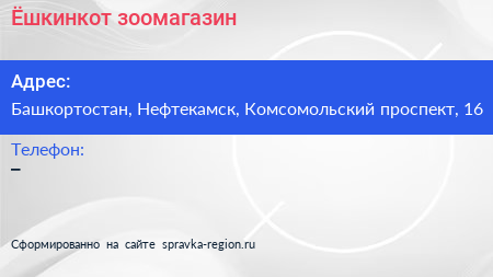 Ёшкинкот, зоомагазин по адресу Башкортостан, Нефтекамск, Комсомольский проспект, 16 в дальнейшем Организация, размещена в следующих категориях: