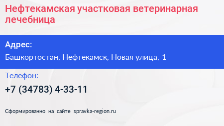 Нефтекамская участковая ветеринарная лечебница по адресу Башкортостан, Нефтекамск, Новая улица, 1 в дальнейшем Организация, размещена в следующих категориях: