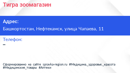 Тигра, зоомагазин по адресу Башкортостан, Нефтекамск, улица Чапаева, 11 в дальнейшем Организация, размещена в следующих категориях: