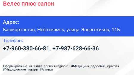 Велес плюс, салон по адресу Башкортостан, Нефтекамск, улица Энергетиков, 11Б в дальнейшем Организация, размещена в следующих категориях: