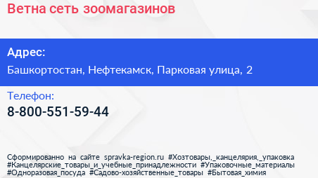 Ветна, сеть зоомагазинов по адресу Башкортостан, Нефтекамск, Парковая улица, 2 в дальнейшем Организация, размещена в следующих категориях:
