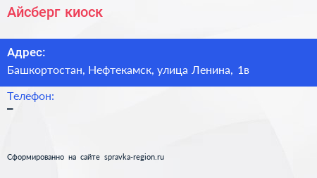 Айсберг, киоск по адресу Башкортостан, Нефтекамск, улица Ленина, 1в в дальнейшем Организация, размещена в следующих категориях: