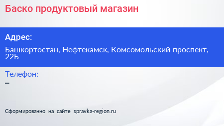 Баско, продуктовый магазин по адресу Башкортостан, Нефтекамск, Комсомольский проспект, 22Б в дальнейшем Организация, размещена в следующих категориях: