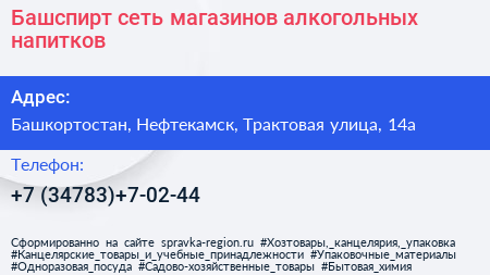 Башспирт, сеть магазинов алкогольных напитков по адресу Башкортостан, Нефтекамск, Трактовая улица, 14а в дальнейшем Организация, размещена в следующих категориях: