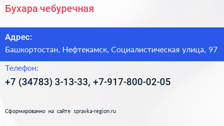 Бухара, чебуречная по адресу Башкортостан, Нефтекамск, Социалистическая улица, 97 в дальнейшем Организация, размещена в следующих категориях: