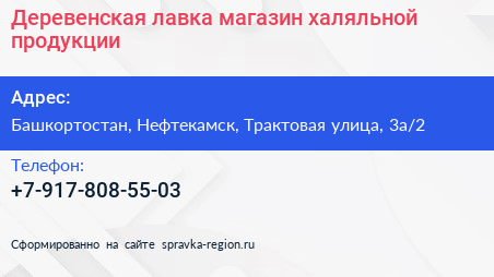 Деревенская лавка, магазин халяльной продукции по адресу Башкортостан, Нефтекамск, Трактовая улица, 3а/2 в дальнейшем Организация, размещена в следующих категориях: