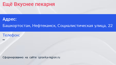 Ещё Вкуснее, пекарня по адресу Башкортостан, Нефтекамск, Социалистическая улица, 22 в дальнейшем Организация, размещена в следующих категориях:
