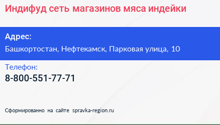 Индифуд, сеть магазинов мяса индейки по адресу Башкортостан, Нефтекамск, Парковая улица, 10 в дальнейшем Организация, размещена в следующих категориях: