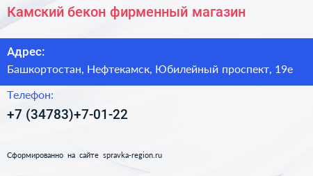 Камский бекон, фирменный магазин по адресу Башкортостан, Нефтекамск, Юбилейный проспект, 19е в дальнейшем Организация, размещена в следующих категориях: