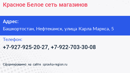 Красное & Белое, сеть магазинов по адресу Башкортостан, Нефтекамск, улица Карла Маркса, 5 в дальнейшем Организация, размещена в следующих категориях: