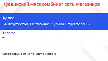 Куединский мясокомбинат, сеть магазинов по адресу Башкортостан, Нефтекамск, улица Строителей, 71 в дальнейшем Организация, размещена в следующих категориях: