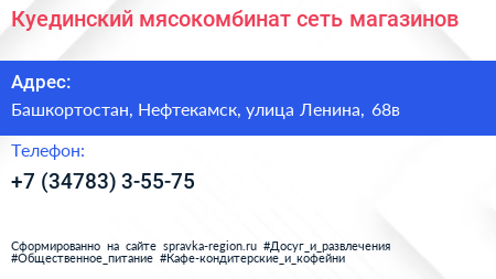 Куединский мясокомбинат, сеть магазинов по адресу Башкортостан, Нефтекамск, улица Ленина, 68в в дальнейшем Организация, размещена в следующих категориях: