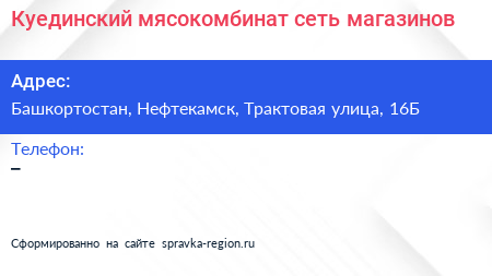 Куединский мясокомбинат, сеть магазинов по адресу Башкортостан, Нефтекамск, Трактовая улица, 16Б в дальнейшем Организация, размещена в следующих категориях: