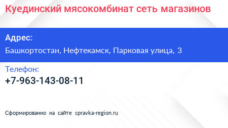 Куединский мясокомбинат, сеть магазинов по адресу Башкортостан, Нефтекамск, Парковая улица, 3 в дальнейшем Организация, размещена в следующих категориях: